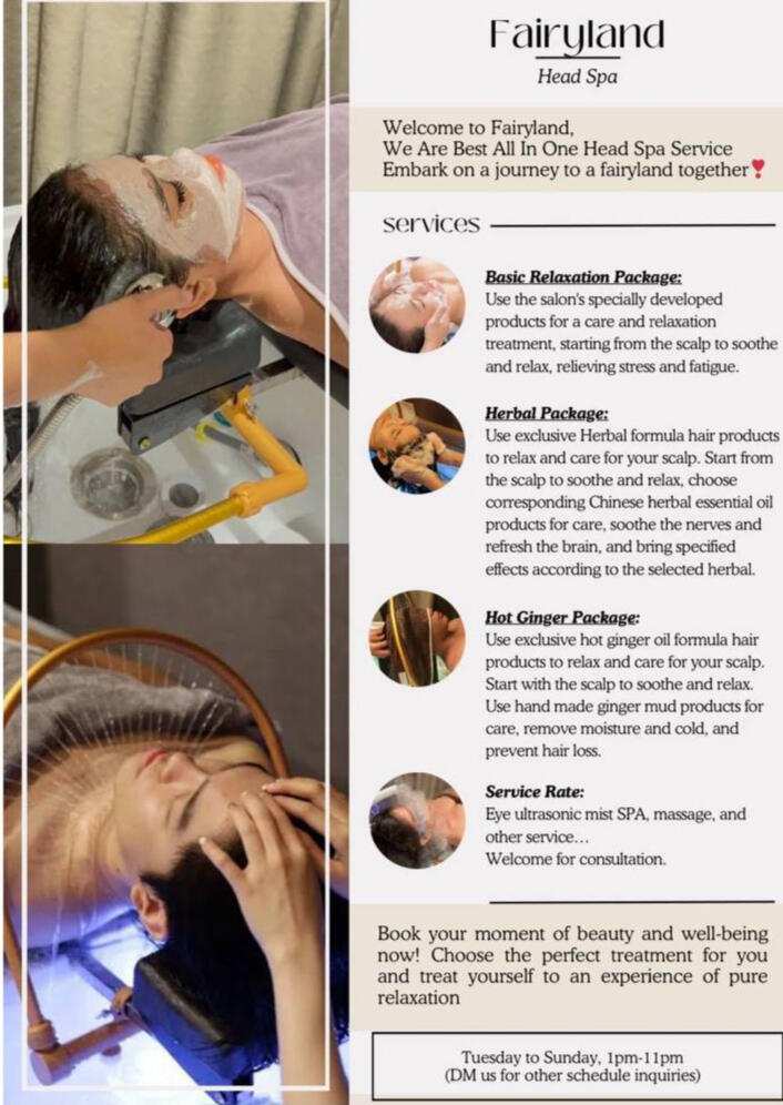 At Fairyland, we offer a variety of treatments from deep scalp cleansing and facial care to hot ginger oil massage — each tailored for total physical and mental relaxation.